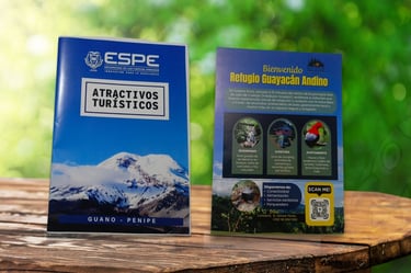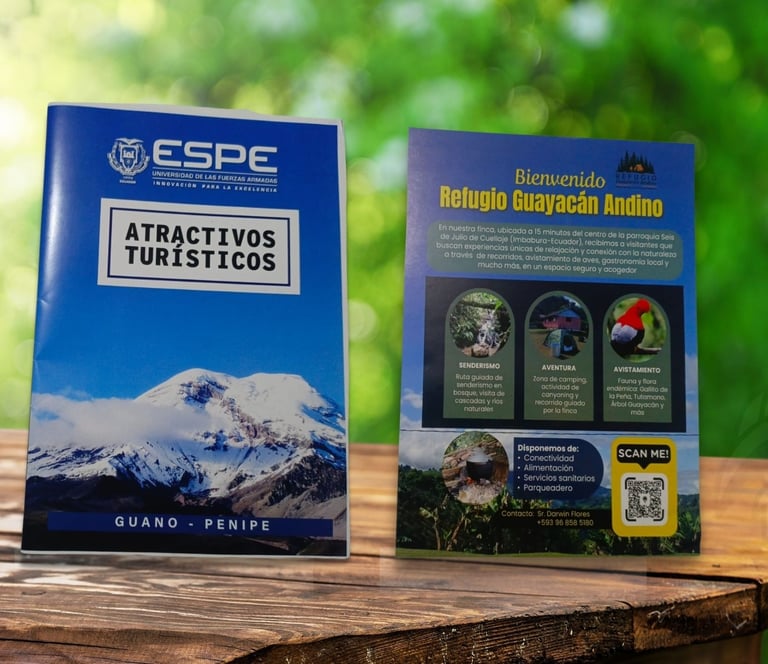 Diseño de revista con fotografías e información sobre atractivos turísticos de Guano y Penipe, desarrollado para proyecto de investigación para la Universidad ESPE.